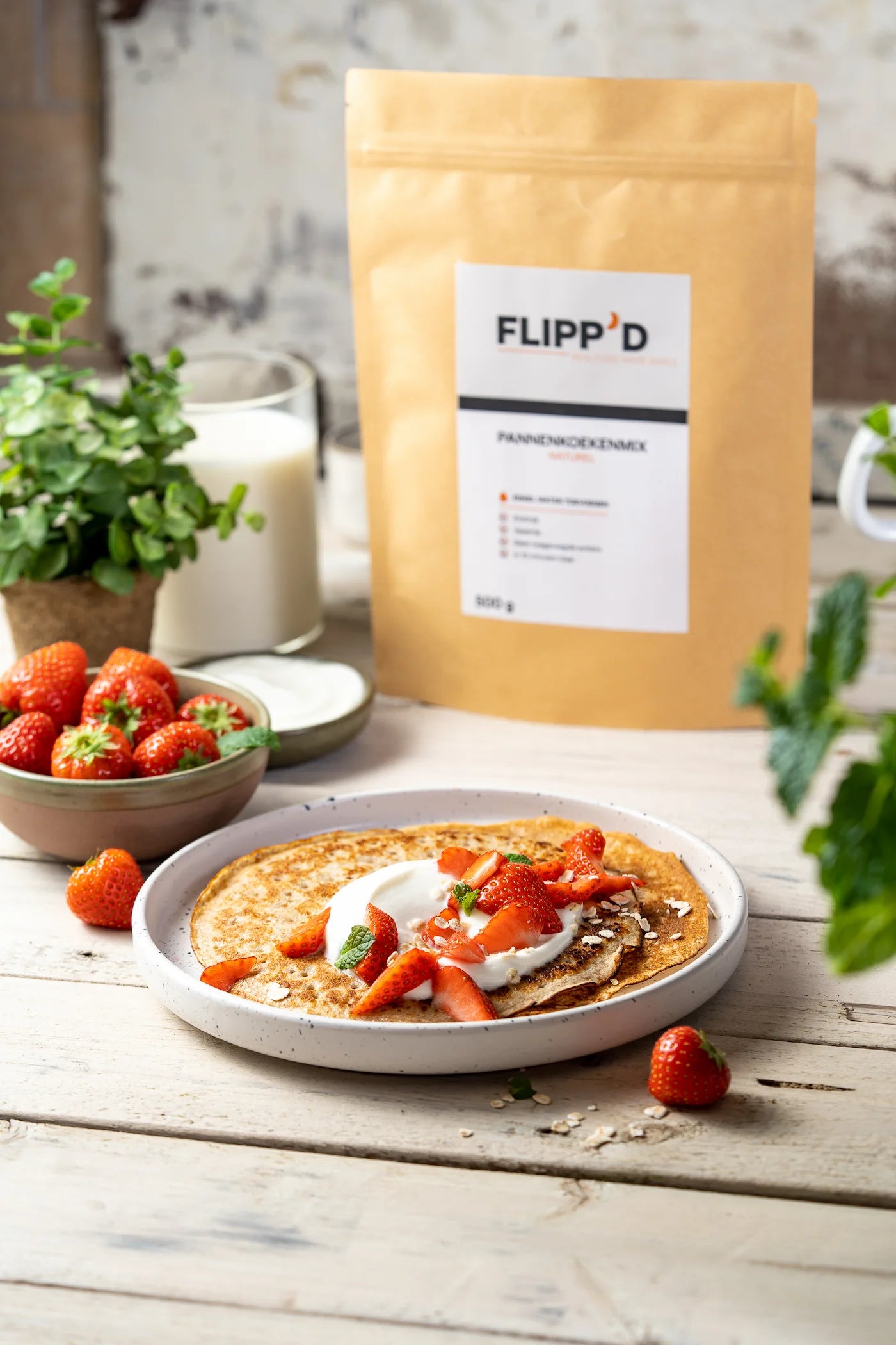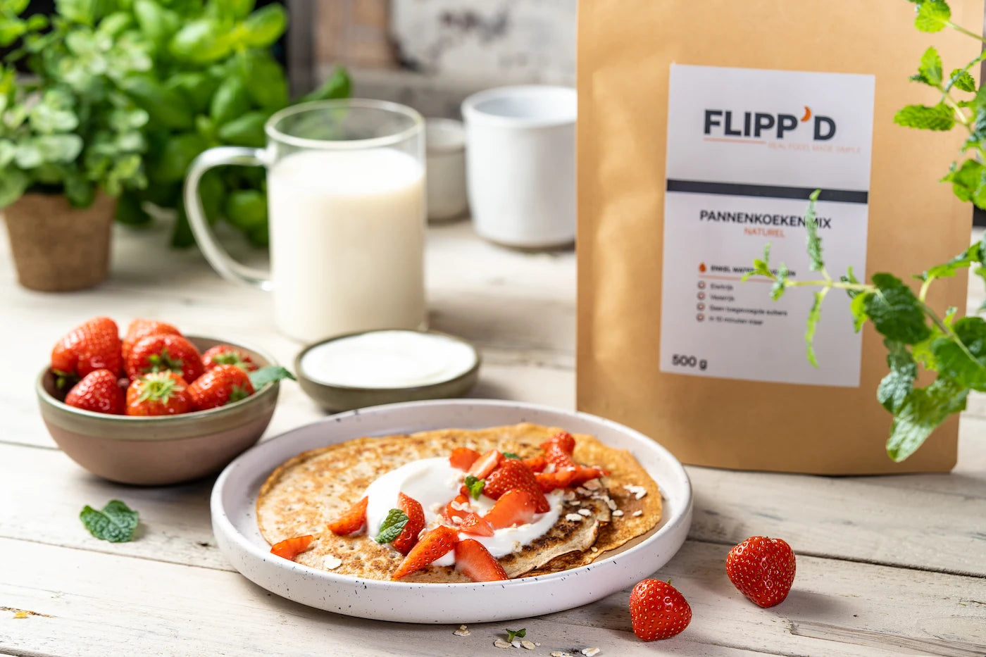 De pannenkoek is geliefd, vertrouwd en tijdloos. Maar als product is hij in decennia nauwelijks veranderd. Dezelfde basisingrediënten. Dezelfde magere voedingswaarde. Hetzelfde hongerige gevoel een uur later. Wij veranderen dat. Niet door de pannenkoek iets anders te maken dan hij is, maar door hem te geven wat hij altijd al had moeten hebben. Een samenstelling die past bij de maaltijd die hij wil zijn. Flipp'd maakt van de pannenkoek een functionele maaltijd. Eén die je 's ochtends vroeg de dag in helpt, 's middags op kracht houdt en 's avonds gewoon lekker is. Zonder concessies aan smaak. Zonder gedoe in de keuken.